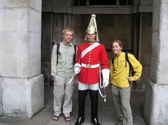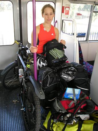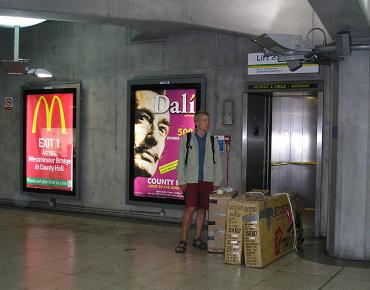 Joan with all of our gear on the tube as we prepare to head out of London. The black pannier bags are on my bike and the yellow bag is the trailer that Zac pulls on his bike, which is separate on the left. Our rediculous gear load has only gotten worse as we have journeyed along. More and more odd things are being strapped to the outside of the trailer and my panniers, especially since here we are each carrying daypacks full of more gear that later must be added to the bike load.